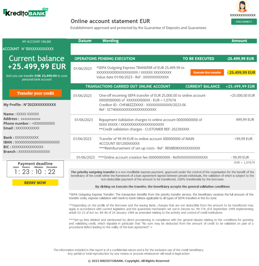 Reminder - As soon as you sign your contract, you will receive your access codes to transfer the funds directly online to your personal bank account. Depending on the profile of the Borrower and the issuing Bank, charges may apply which are not deductible from the amount to be transferred