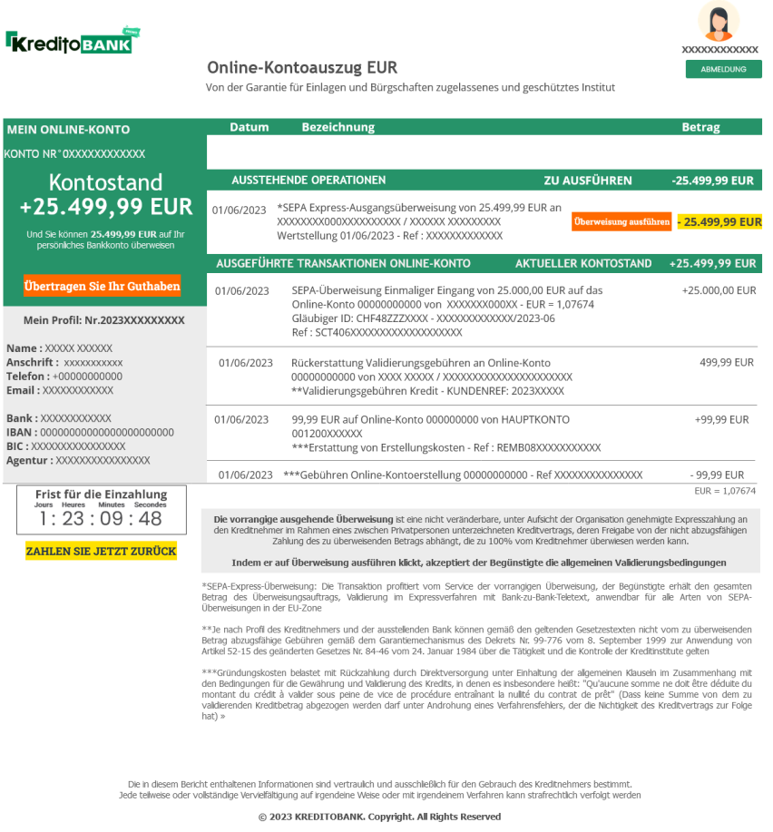 Recordatorio - En cuanto firme su contrato, recibirá sus códigos de acceso para transferir los fondos directamente en línea a su cuenta bancaria personal. En función del perfil del Prestatario y del Banco emisor, pueden aplicarse gastos que no son deducibles del importe a transferir